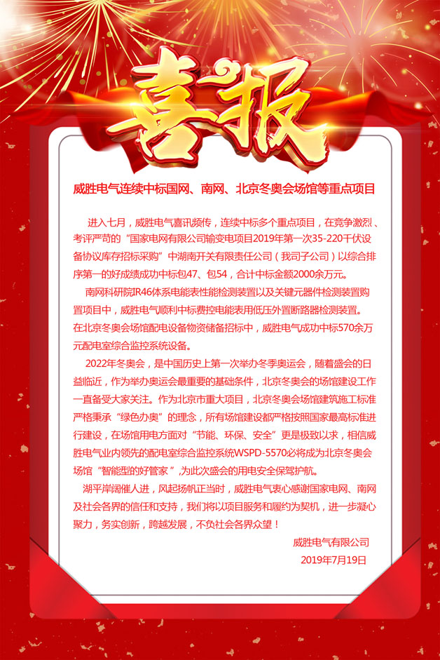 進入七月,威勝電氣喜訊頻傳,連續中標多個重點項目,在競爭激烈 、考評嚴苛的“國家電網有限公司輸變電項目2019年第一次35-220千伏設備協議庫存招標采購”中湖南開關有限責任公司(我司子公司)以綜合排序第一的好成績成功中標包47、包54,合計中標金額2000余萬元。