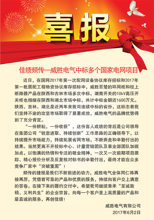 頻傳的捷報是我們不斷前進的動力,威勝電氣全體同仁將再接再厲,憑借著可靠的產(chǎn)品和優(yōu)質(zhì)的服務,持續(xù)向客戶交上滿意的答卷。在接下來的履約交付中,希望我司繼續(xù)秉承“至誠致精、義利共生”的企業(yè)宗旨,向每一個客戶呈上高質(zhì)量的產(chǎn)品和最真誠的服務,再創(chuàng)佳績!