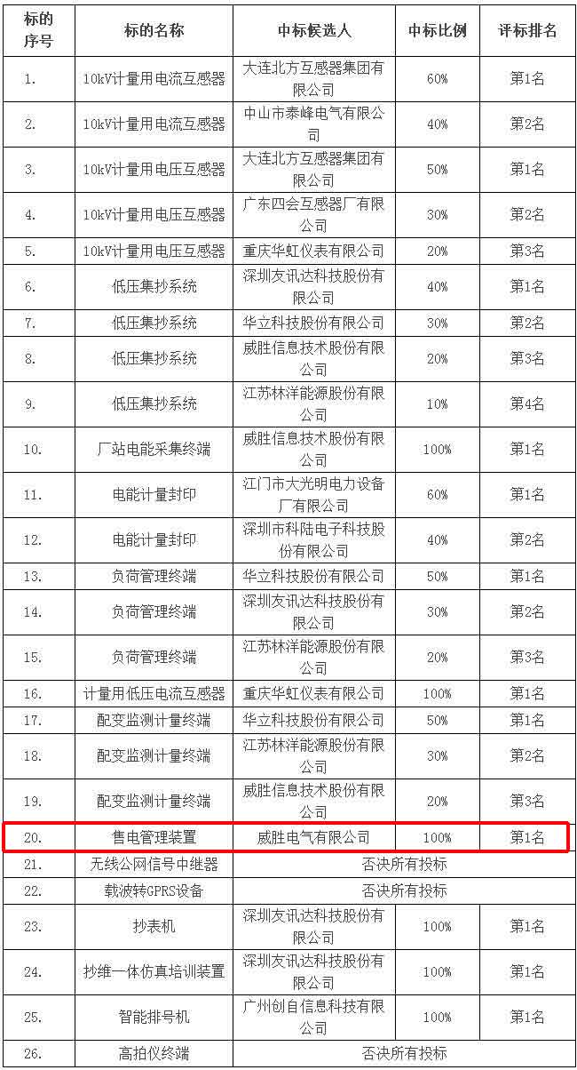 3月9日,中國(guó)南方電網(wǎng)官方網(wǎng)站公示了《廣州供電局有限公司2018年?duì)I銷(xiāo)計(jì)量類(lèi)物資框架招標(biāo)結(jié)果》,公示顯示:經(jīng)評(píng)標(biāo)委員會(huì)多輪評(píng)審,最終推薦了本項(xiàng)目十二個(gè)中標(biāo)候選人,威勝電氣有限公司赫然出現(xiàn)在此份名單中,威勝電氣在“售電管理裝置”這個(gè)標(biāo)的上,以第一名的評(píng)標(biāo)成績(jī),100%的中標(biāo)比例獨(dú)占此標(biāo)。這條消息讓所有威勝人感到歡欣鼓舞,同時(shí),我們也將繼續(xù)努力,繼續(xù)致力于讓每一座城市,每一個(gè)社區(qū)、每一家企業(yè),每一戶(hù)家庭都因享用威勝的產(chǎn)品、技術(shù)和服務(wù)而持久受益!