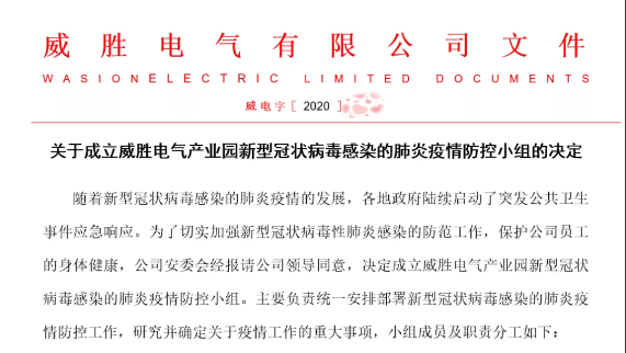 自疫情發生以來,威勝電氣成立以公司董事長為領導組組長的疫情防控小組, 健全決策高效、運轉協調的指揮體系,公司高層靠前指揮,對防控工作親自部署、督辦,多次組織召開線上防控疫情工作會議。并先后發布《關于進一步做好新型冠狀病毒感染的肺炎疫情防控工作的通知》等相關文件,對園區防疫和復工進行全面部署,對出入園管控、環境衛生、就餐管理、考勤辦公、宣傳引導等各項防控措施進行細化并責任到人。
