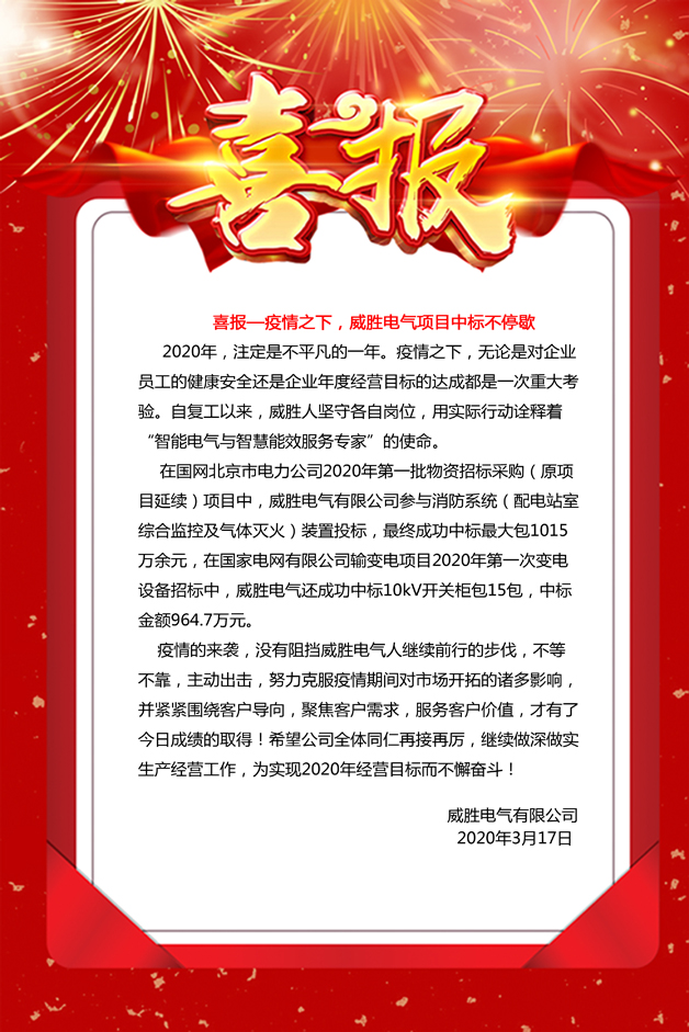 在國網北京市電力公司2020年第一批物資招標采購(原項目延續)項目中,威勝電氣有限公司參與消防系統(配電站室綜合監控及氣體滅火)裝置投標,最終成功中標最大包1015萬余元,在國家電網有限公司輸變電項目2020年第一次變電設備招標中,威勝電氣還成功中標10kV開關柜包15包,中標金額964.7萬元。