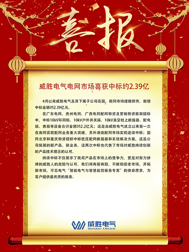 4月以來威勝電氣及其下屬子公司在國(guó)、南網(wǎng)市場(chǎng)捷報(bào)頻傳,新增中標(biāo)金額約2.39億元。