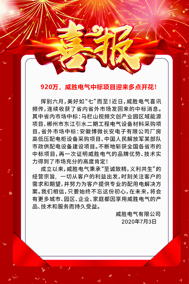 揮別六月,美好如“七”而至!近日,威勝電氣喜訊頻傳,連續(xù)收獲了省內(nèi)省外市場發(fā)回來的中標(biāo)消息。其中省內(nèi)市場中標(biāo):馬欄山視頻文創(chuàng)產(chǎn)業(yè)園區(qū)域能源項目、郴州市東江引水二期工程電氣設(shè)備材料采購項目,省外市場中標(biāo):安徽博微長安電子有限公司廠房高低壓配電柜設(shè)備采購項目、中國人民解放軍某部隊市政供配電設(shè)備建設(shè)項目。不斷地斬獲全國各省市的中標(biāo)項目,再一次證明威勝電氣的品牌優(yōu)勢、技術(shù)實力得到了市場充分的高度肯定!
