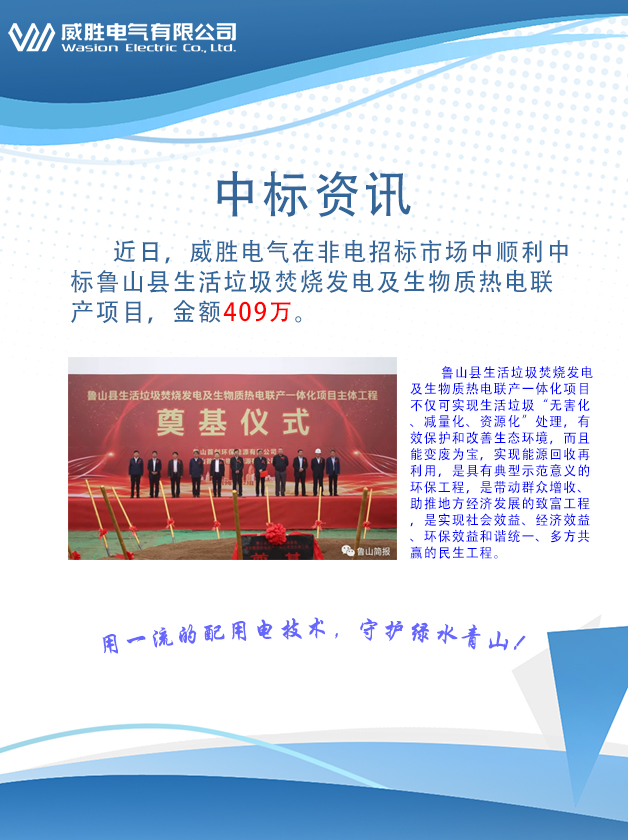 近日,威勝電氣在非電招標市場中順利中標魯山縣生活垃圾焚燒發電及生物質熱電聯產項目,金額409萬。