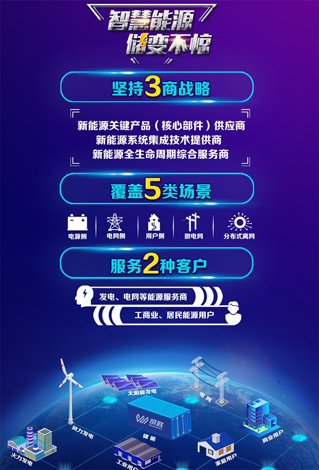 惟遠能源產業技術有限公司,智慧新能源與能效服務專家。儲能,是實現“智慧能源”的重要手段,威勝“儲能+”屬于“新能源+”內涵,是公司未來著重發展的業務。為了更好地服務客戶,威勝針對大型能源系統、微電網、分布式離網系統提出5類儲能應用場景,分別提供解決方案與服務。